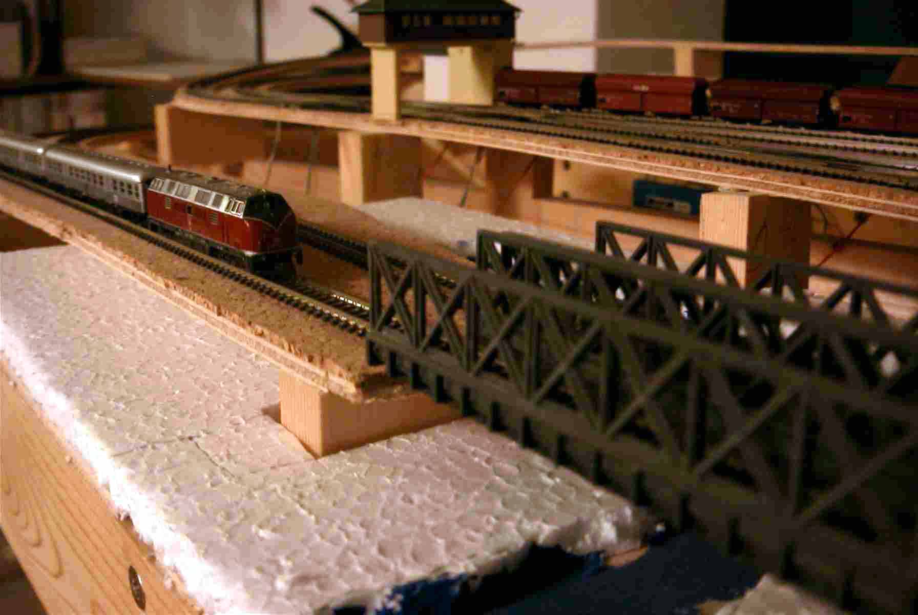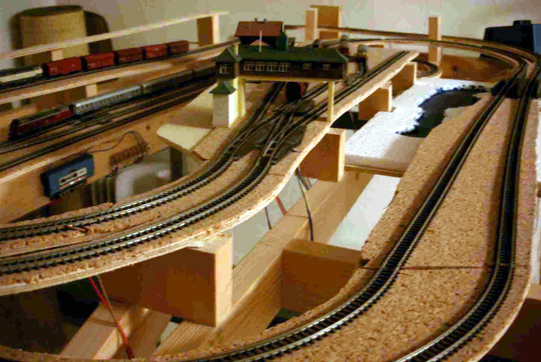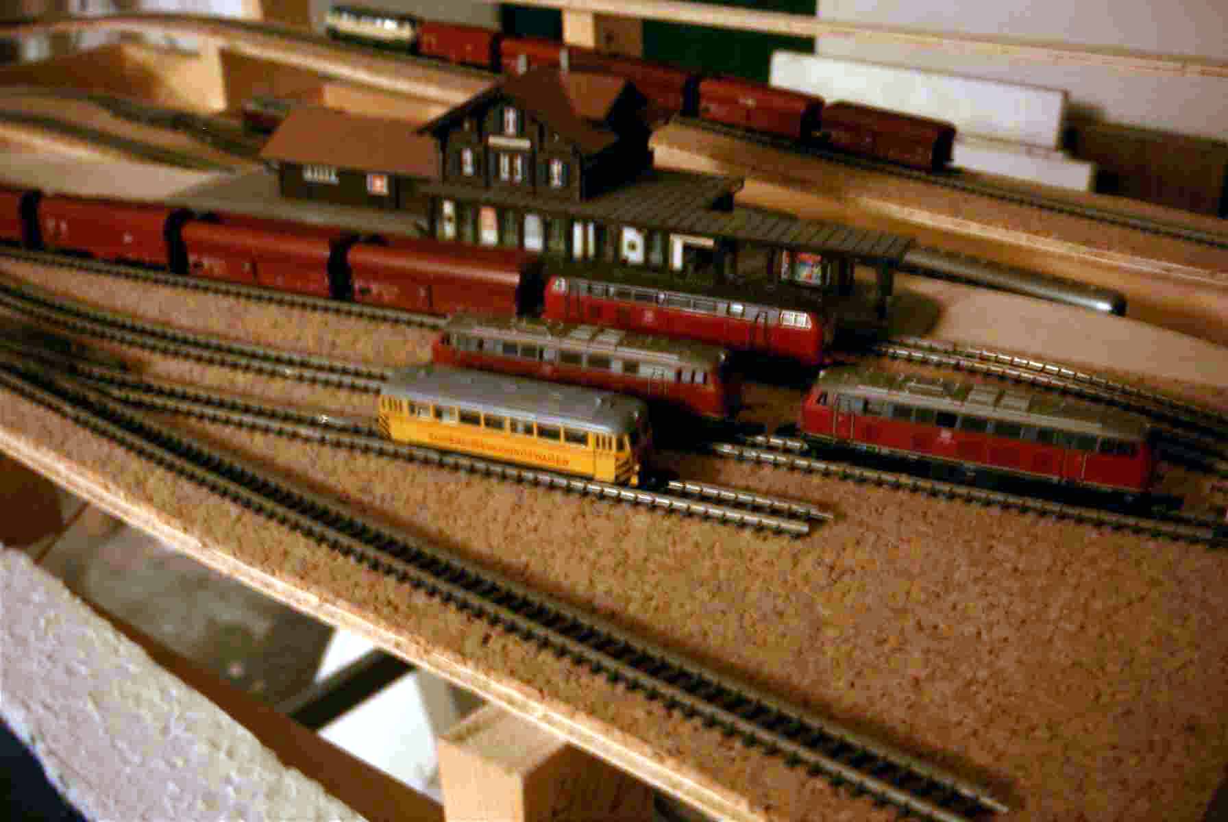 Der erste Versuch geht auf Projekt aus einem Märklin Magazin zurück. Größe 1.25x0.67m. Diese wird warscheinlich nie fertig gebaut. Hier wird jetzt erst alles getestet bevor es bei der Neuen verwendet wird. Die Bilder sind noch aus der Startphase. Zur Zeit ist sie schon komplett auf Digital umgebaut worden. Es wurden Beseztmelder und Weichendecoder von Rautenhaus eingebaut.